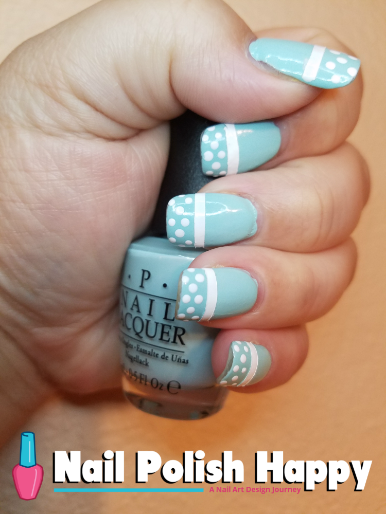 So, my nail art design, while I would’ve been happy to just have a solid color, I wanted to do a design with this color, like the tip of the nail, with a white border and white polka dots. I think it looks pretty cute and classy.